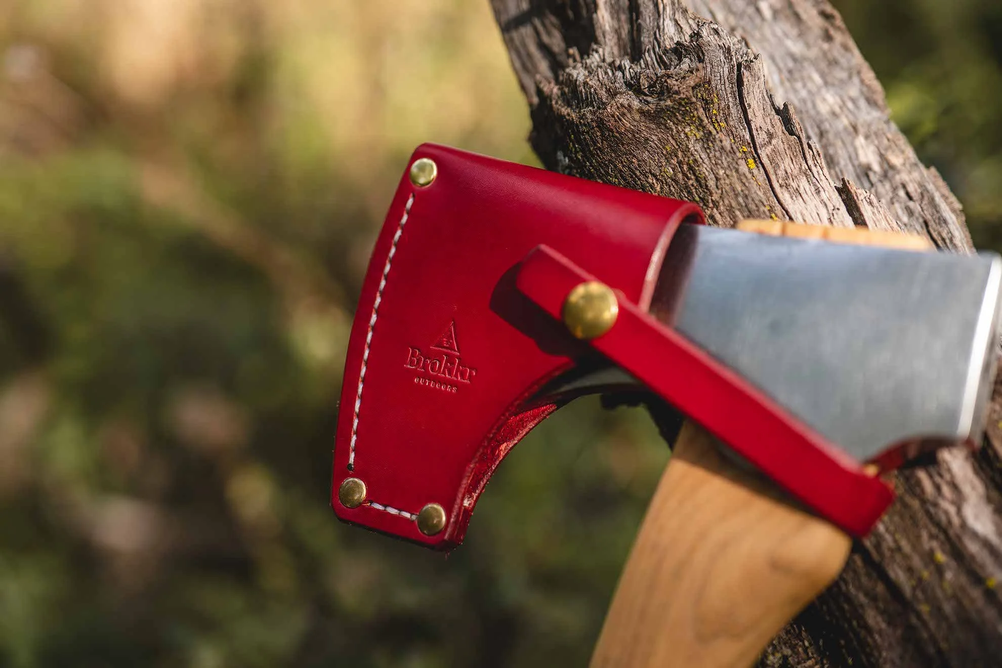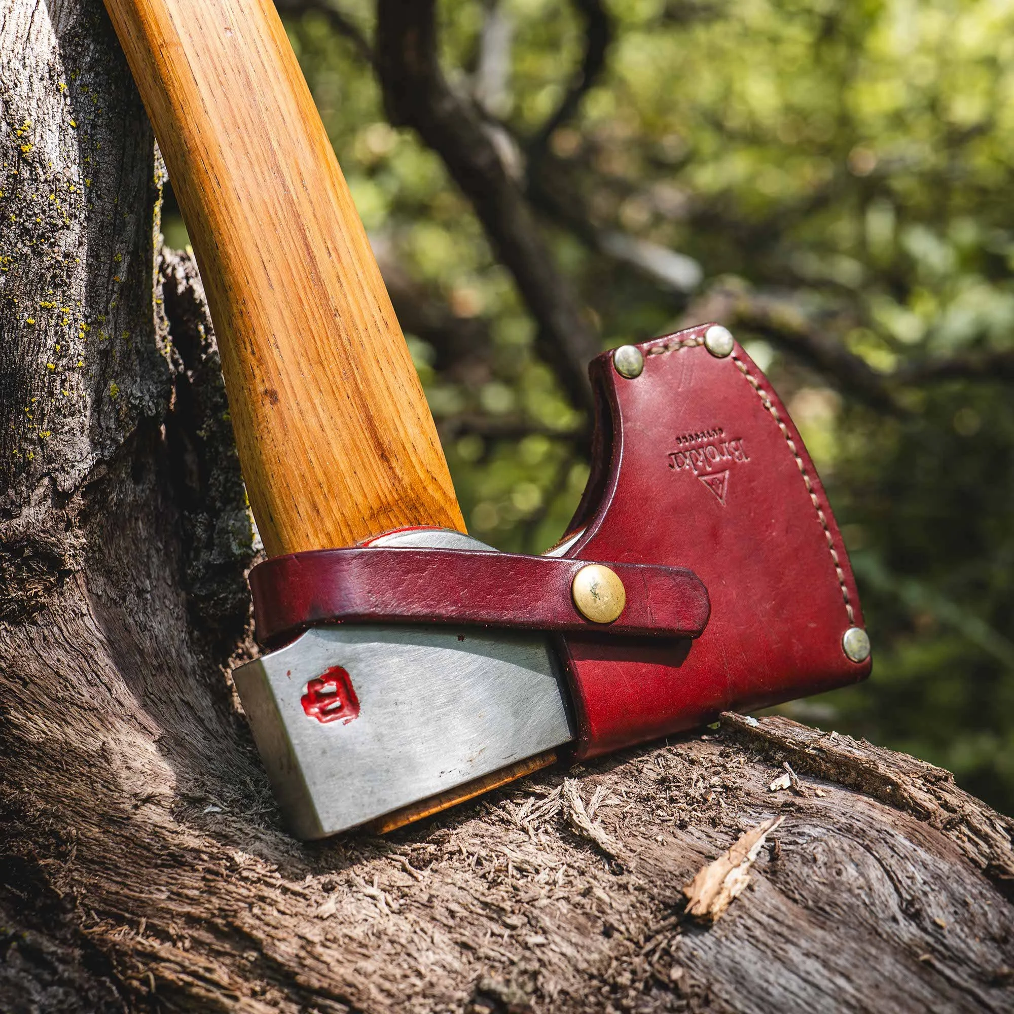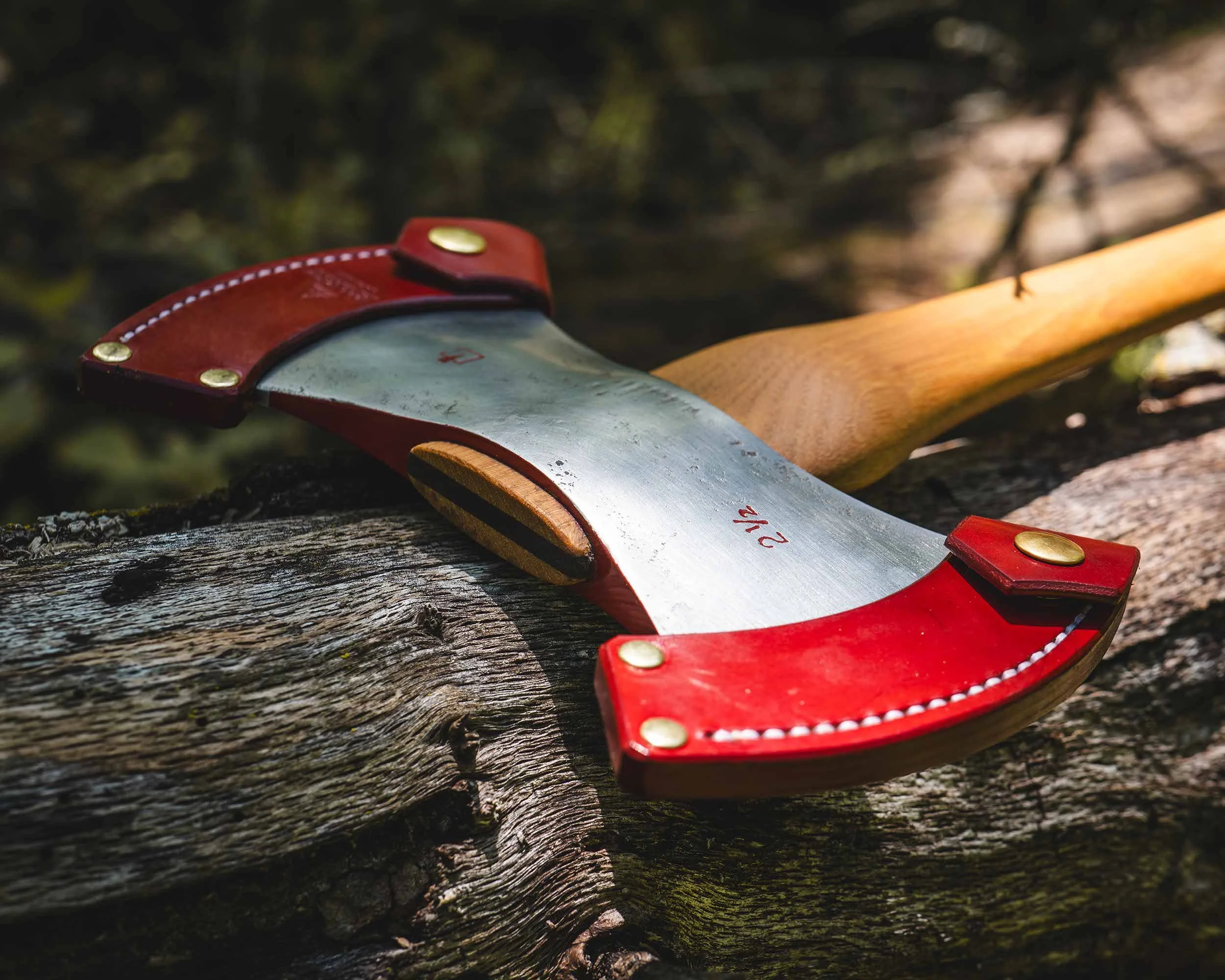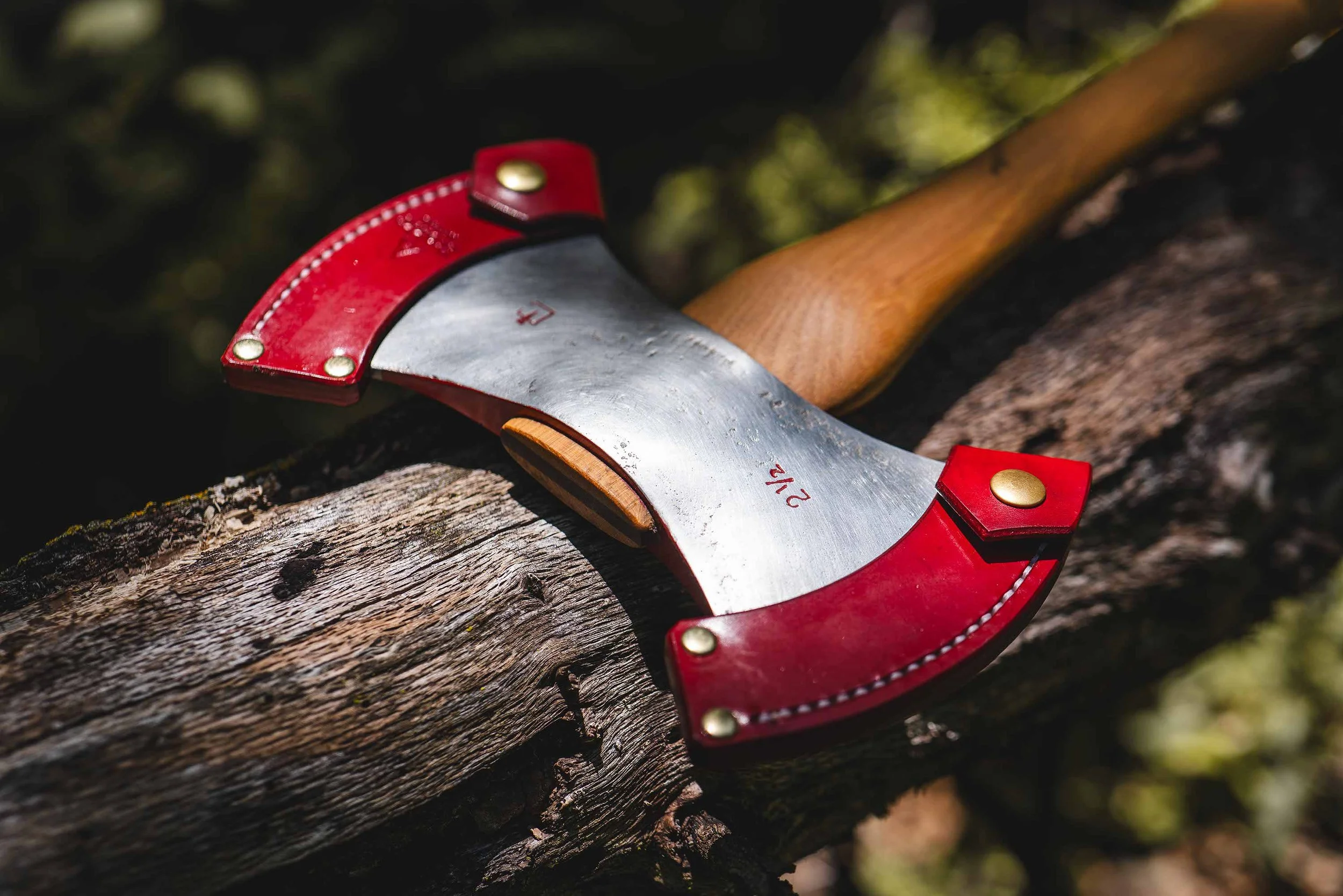 Comes with a hand-made leather sheath that’s built smart: the whole thing slips off as one piece for full access, or you can remove just one side and leave the other in place—perfect for keeping things safe when you’re sitting down to carve or doing finer work with the sharp bit exposed. A thoughtful, packable double-bit that truly earns its spot on any serious bushcraft trip.