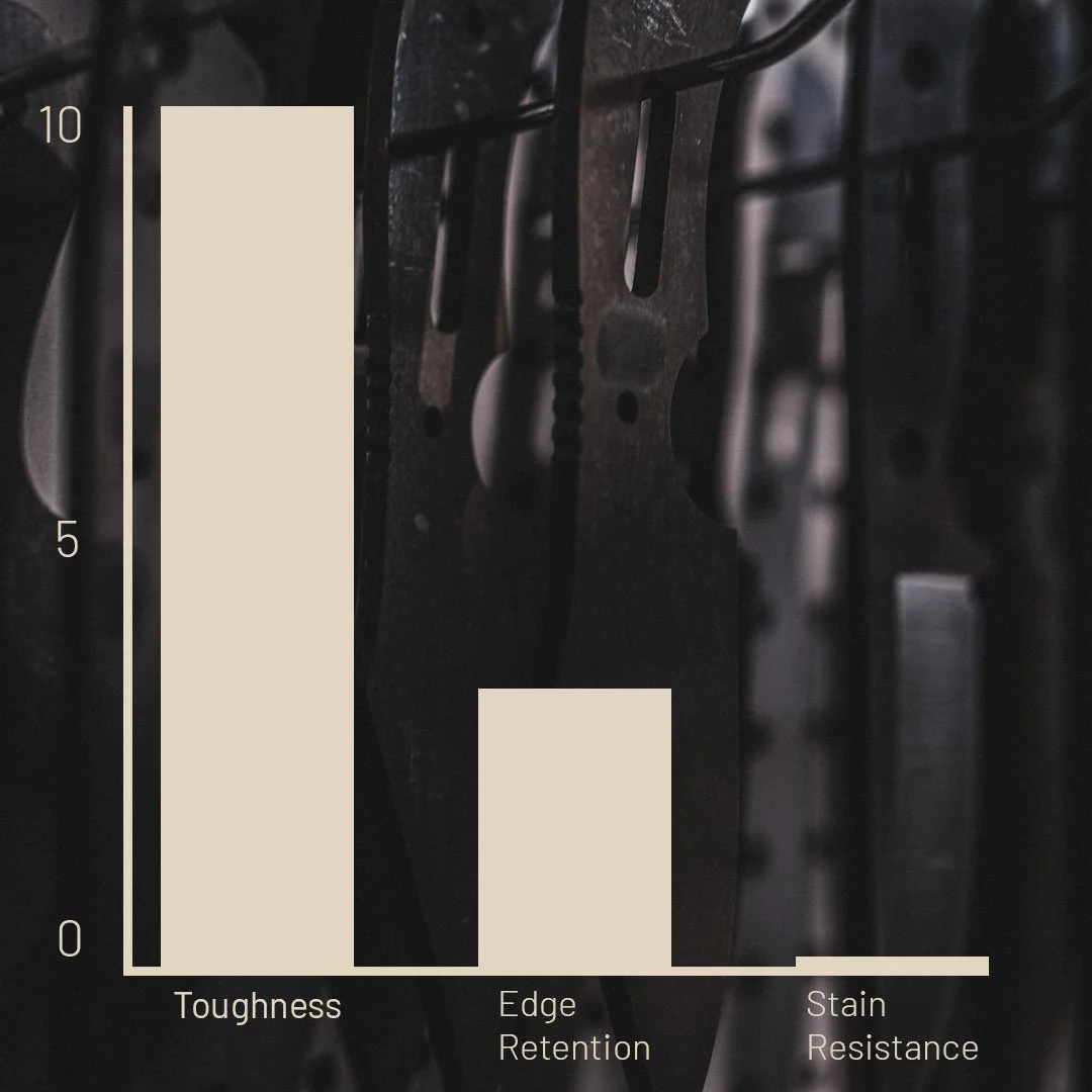 Toughness: Outstanding — one of the toughest knife steels you can buy, period. It’s a modified 5160 with nickel added for even greater impact resistance. You can baton through knots, pry when you shouldn’t, and chop hard all day without chipping or snapping. Very few steels beat it here.