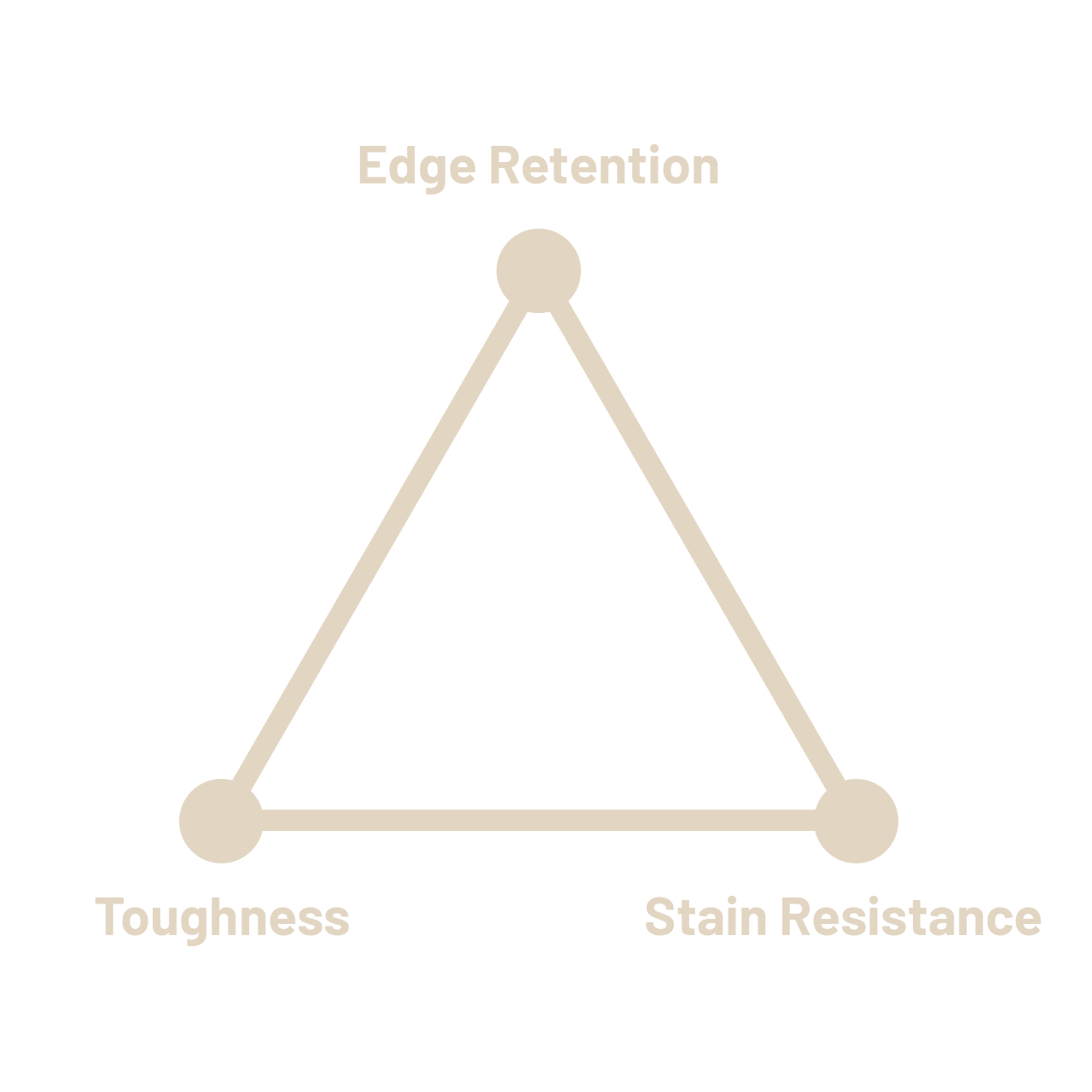 Every knife steel is a balance between three key properties: toughness (resistance to chipping or breaking), edge retention (how long it stays sharp under hard use), and stain resistance (how well it fights rust and corrosion). Most affordable steels let you max out one or two of the three; for example, carbon steels like 8670 is the toughest steel there is and holds an ok edge but will rust if you look at it wrong. A stainless steels like AEB-L keeps it’s toughness and rust resistance, but won’t hold an edge as long. If you want a steel that genuinely excels at all three—tough, scary-sharp for ages, and practically immune to rust—you’re stepping into premium territory (CPM-MagnaCut, etc.), and the price reflects it. Great performance always costs more when physics won’t let you cheat.